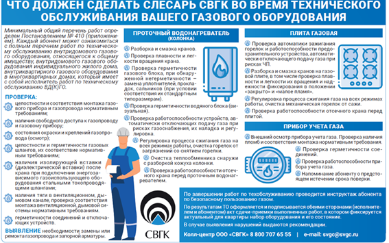 Напоминаем, обеспечение доступа специалистов ГРО для проведения техобслуживания является обязанностью абонентов (п. 42. «Правил пользования газом…», утвержденным Постановлением Правительством РФ № 410). Если в назначенный в объявлении срок проведения ТО ВД(К)ГО абонент не может обеспечить доступ к своему газовому оборудованию, он может позвонить в отделение СВГК по указанному в полученном оповещении телефону и договориться о взаимно удобном времени проведения обслуживания.